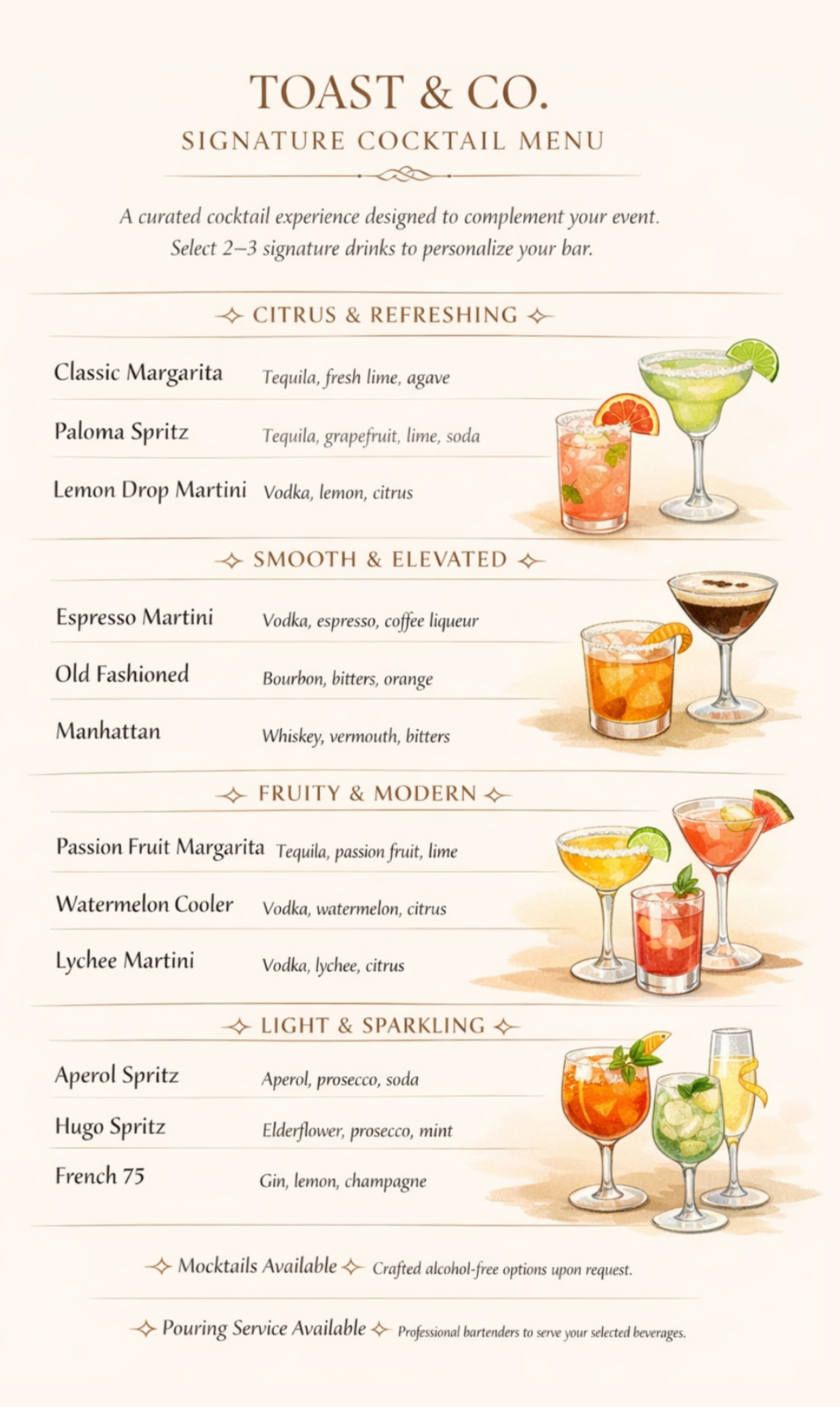 Choose 2–3 cocktails from our menu to create a bar experience tailored to your event. Our team will guide you in selecting drinks that match your style and guest preferences.